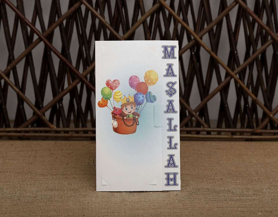 Özel kesimli ve ilginç tasarımlı olarak üzerinde çocukların sevdiği karikatür ve balon resimleri ile maşallah yazısı yazılarak hazırlanmıştır