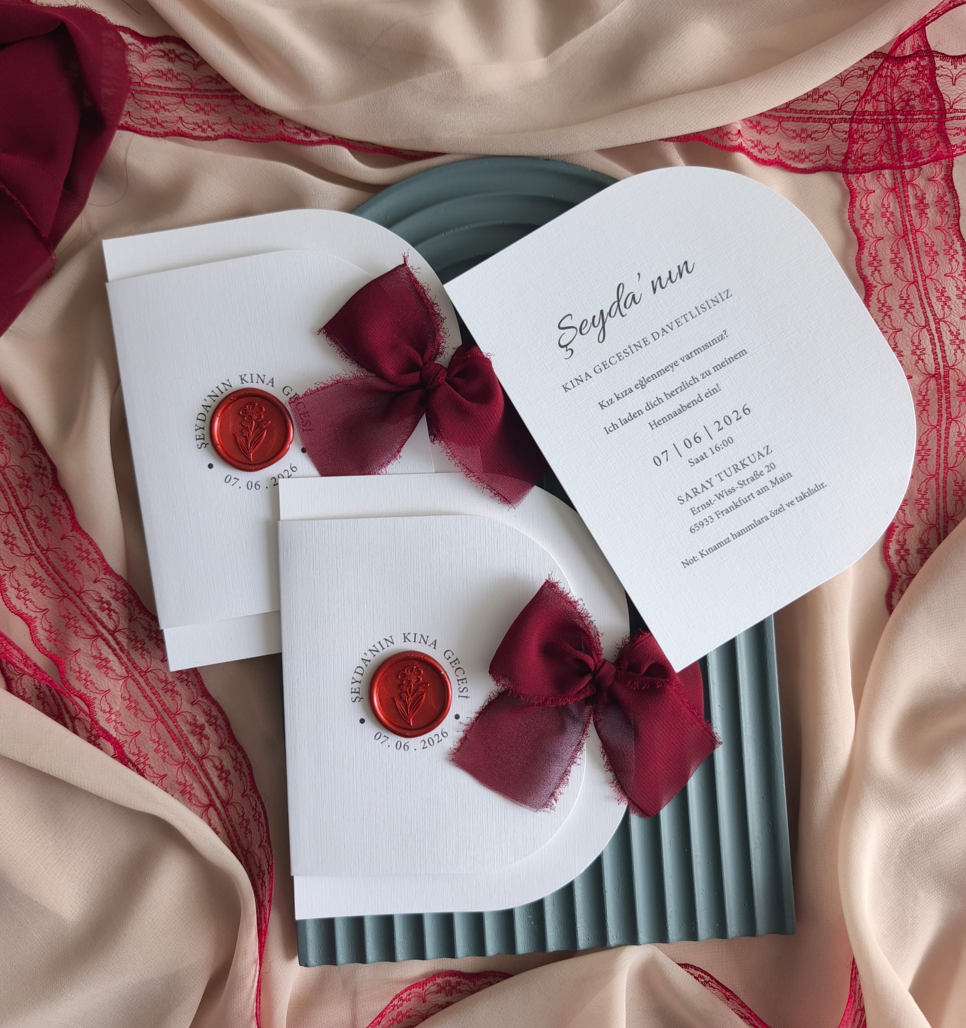 Bordo Kumaş Kurdele Kırık Beyaz Dokulu Kağıt Mühürlü Kına Gecesi Davetiye