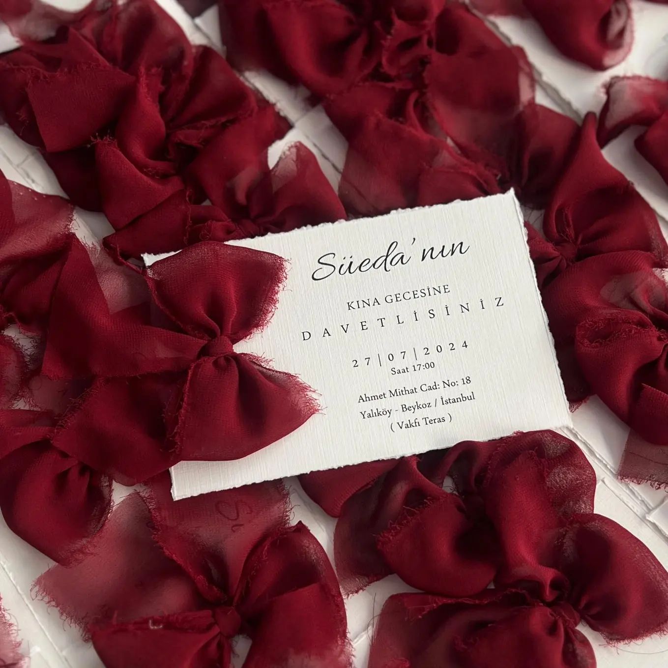 Bordo Renkli Kurdele Dokulu Kağıt  Kenarları Yırtık Kesimli Kına Davetiyesi K9981