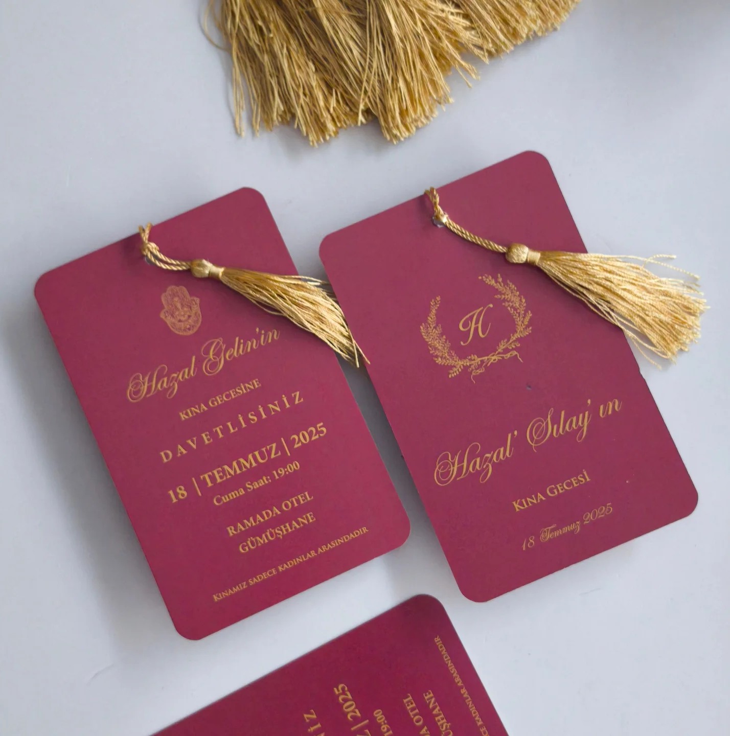 Gold Renkli Püskül Bordo Renkli Baskılı Tek Kart Çift Yönlü Kına Davetiye
