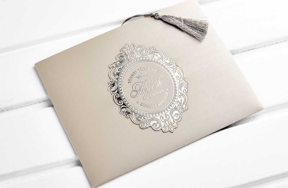 Gri renkli zarf üzerinde gümüş yaldız desen ile içerisinde yine sıvamalı ve kalın gramajlı üzeri gümüş yaldızlı bilgilerin yazıldığı karttan oluşmaktadır