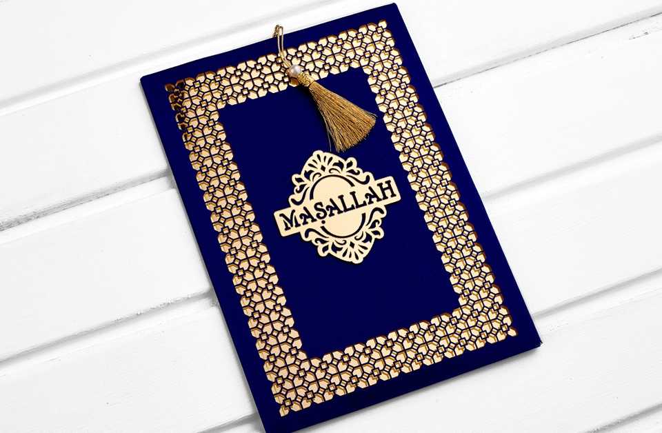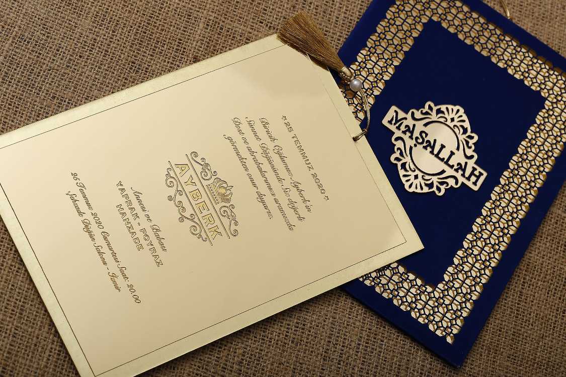 Lacivert renkli lüks flok kadife baskılı altın yaldız desenli ve üzerinde yine altın yaldız olarak basılmış maşallah yazılı çok kaliteli sünnet davetiye