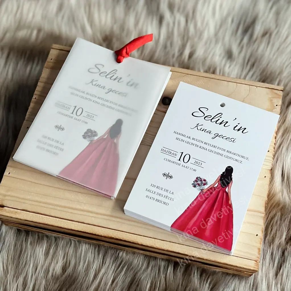 Kırmızı Renkli Gelin Resimli Aydıngerli ve Fiyonklu İkili Kartlı Kına Davetiyesi
