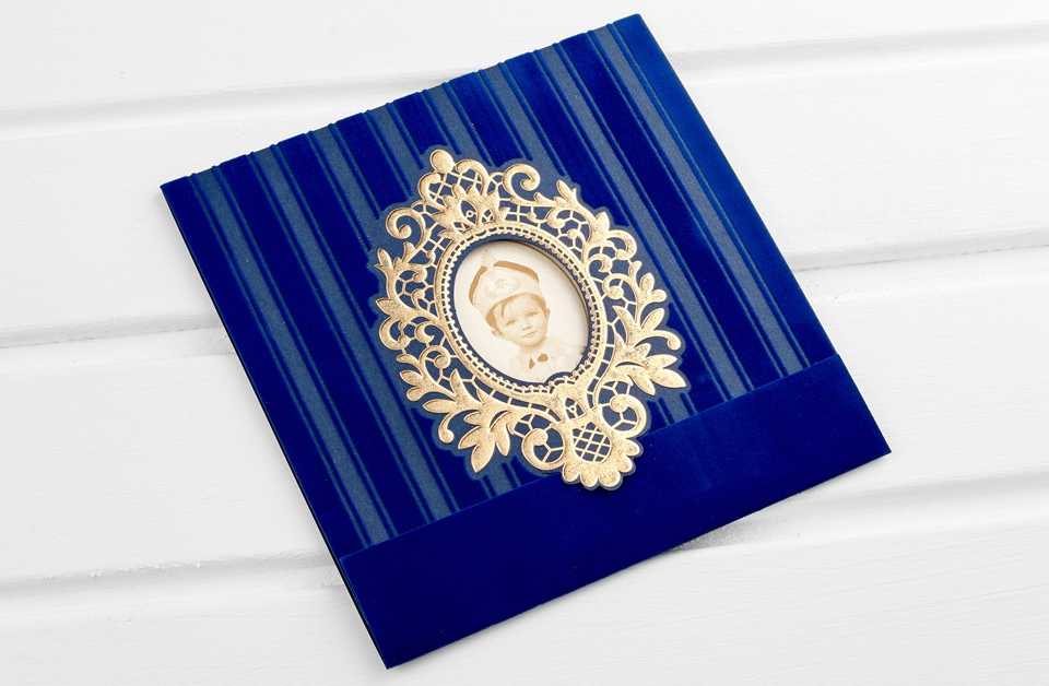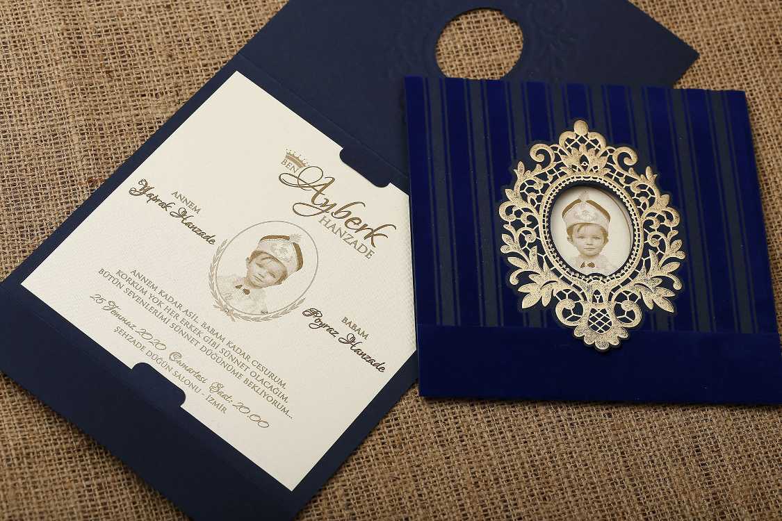 Lacivert renkli flok baskılı kadife tarzı bir baskı ile özel kesimli tasarlanmış zarf modeli ve içerisinde sünnet çocuğunun resmi kullanılmıştır
