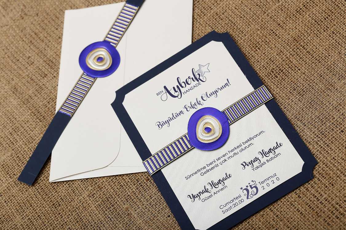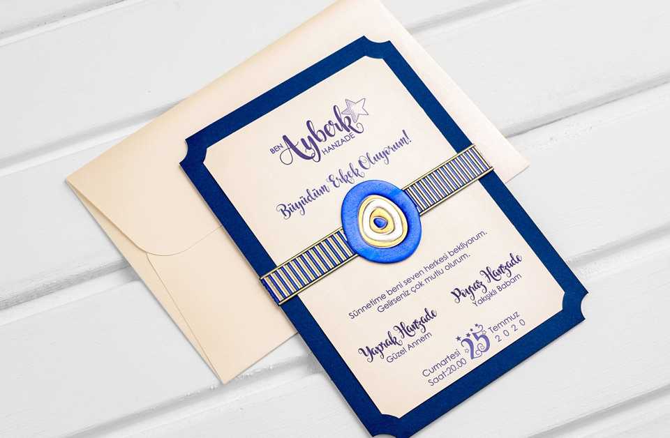 Krem renkli zarf modeli kullanılmış ve iç baskı kartında da yine krem renk ile lacivert renk birlikte kullanılmıştır. nazar boncuğu ortasına takmalı şekilde ayarlanmıştır