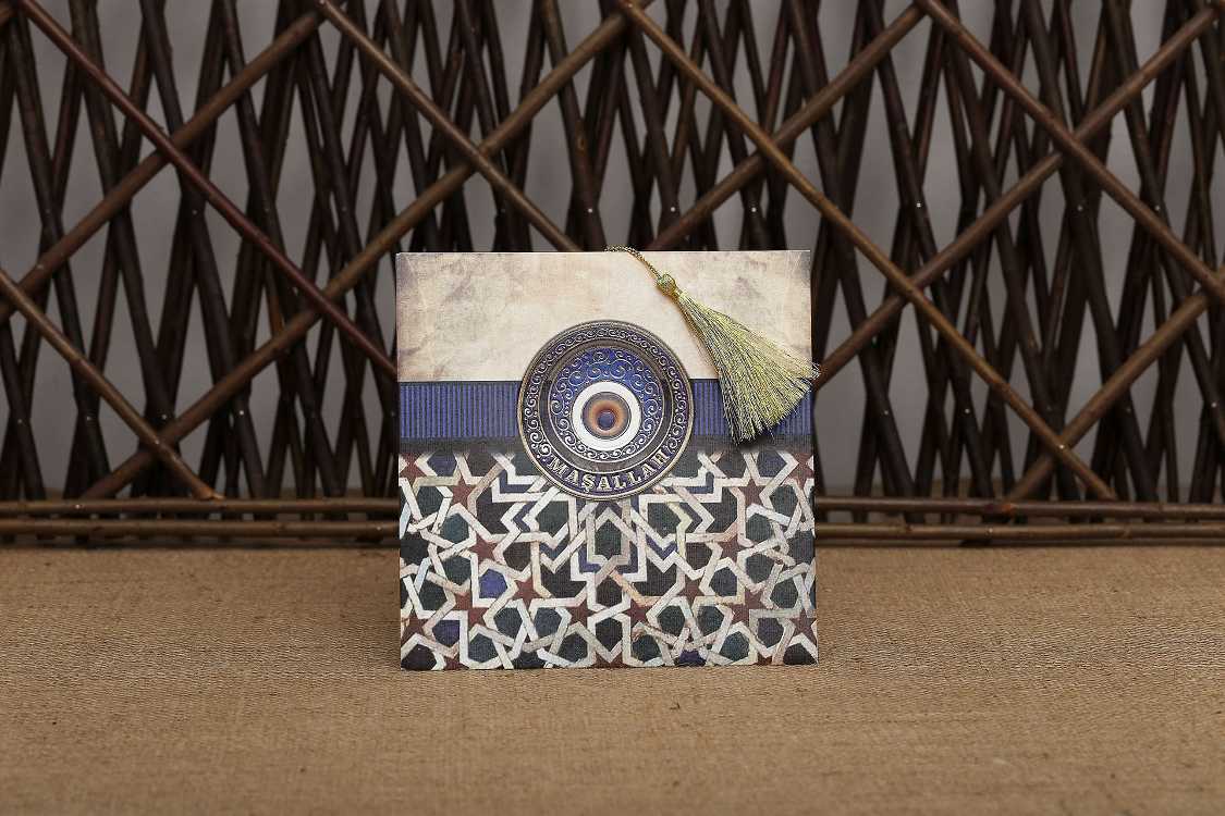 Nazar boncuklu bir tasarım zarf üzerine basılarak lacivert renkli ve desenli şekilde tasarlanmıştır. iç kart üstünde püskül vardır
