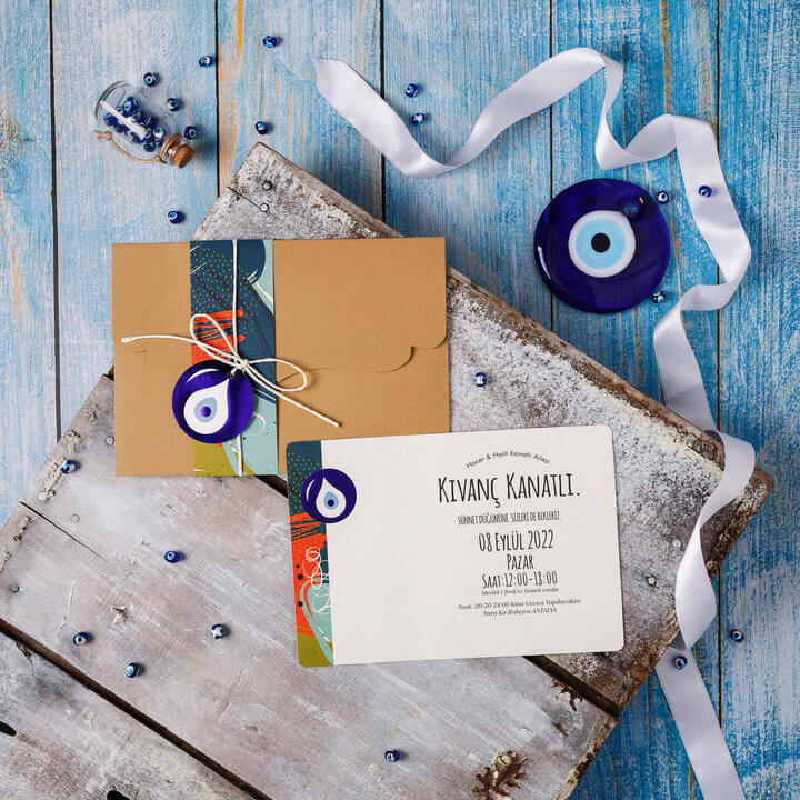 Renkli Etiketli Nazar Boncuklu İp Bağlamalı Sünnet Davetiye 30332