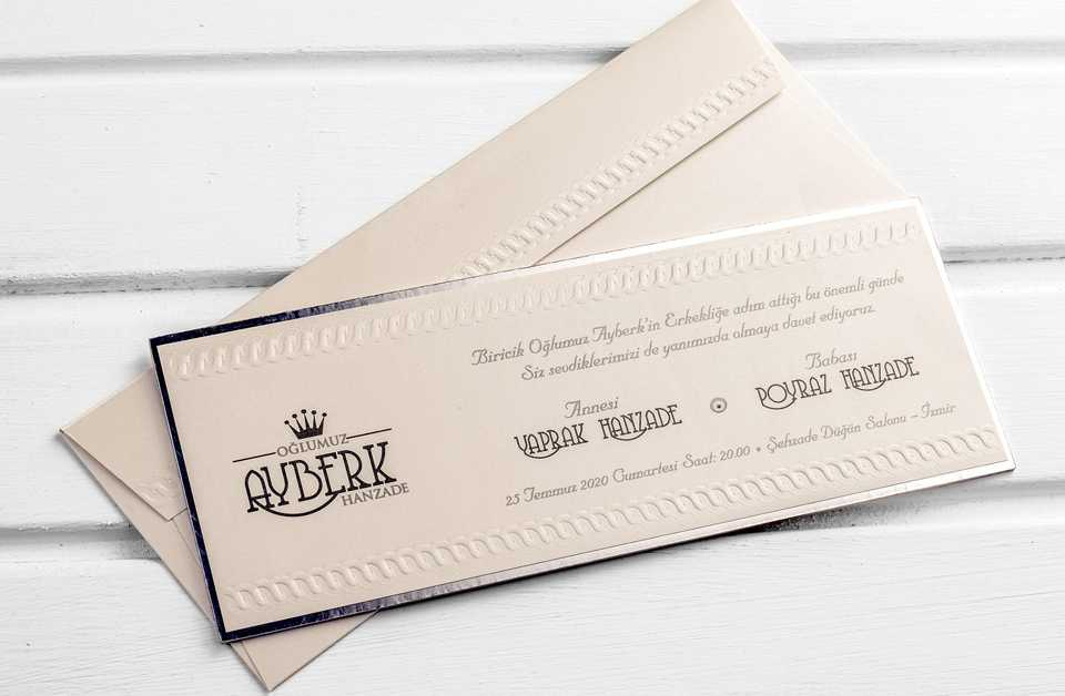 Sade sünnet davetiyesi tercih eden aileler için zarflı olarak tasarlanmış ve renk olarak gümüş gri renkli kenarları ise lacivert renkli desenli olarak tasarlanmıştır